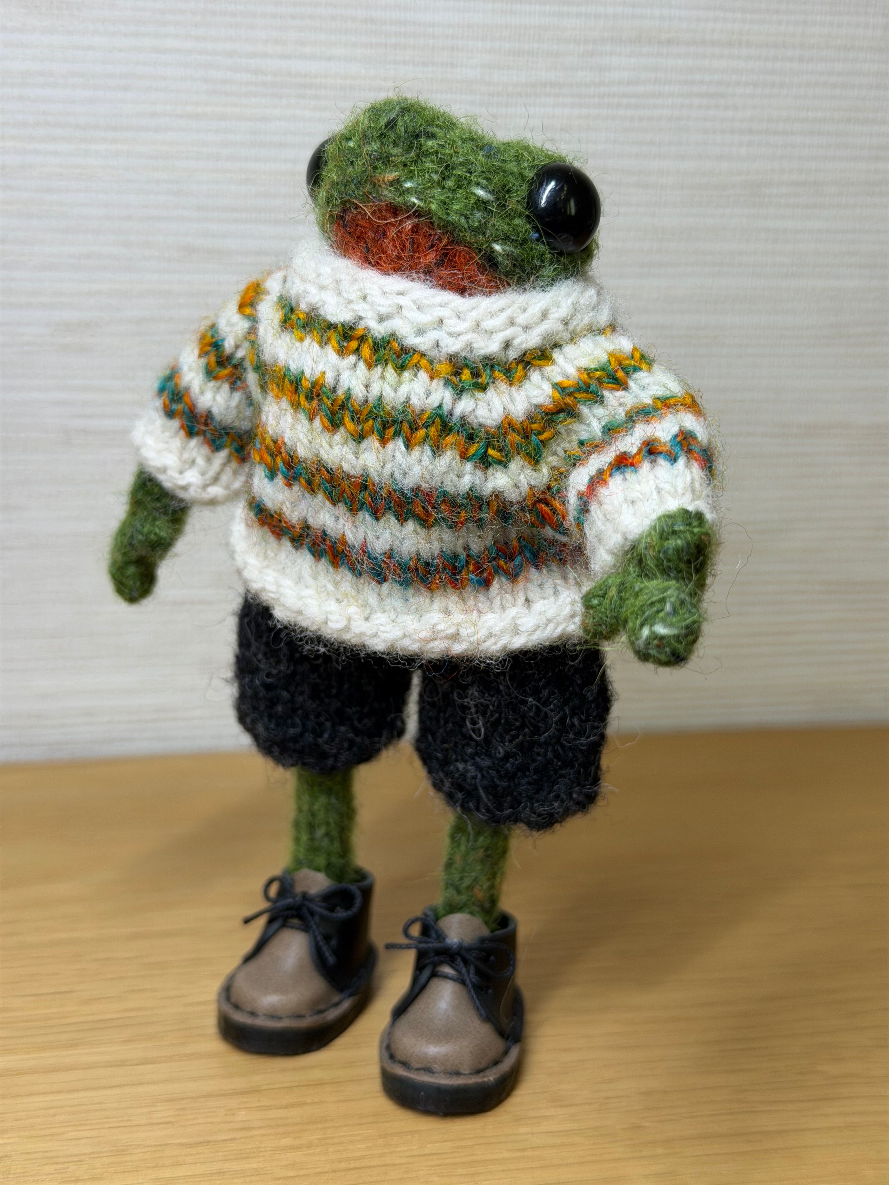 黒い革靴は@hi.to.Tsuさんに特別にカエルくん用に作ってもらいました。今までの靴に比べて少し大きいので、安定性が増しています。